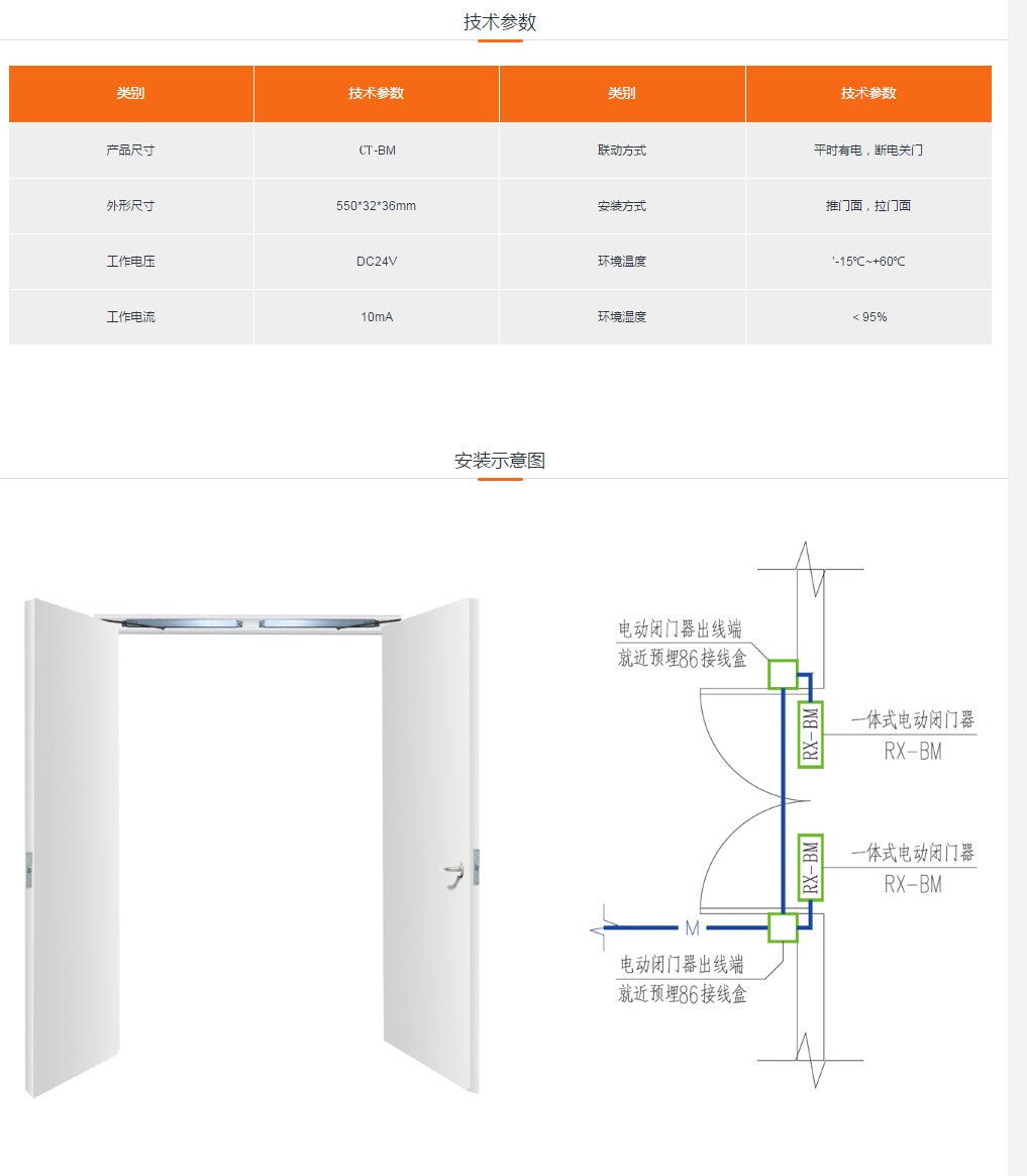CT-BM 防火門電動閉門器 • 完全滿足國家標準GA93-2004《防火門閉門器》的要求; • 通過了與CTPM F100B防火門監控器進行配接的消防型式檢驗; • 電源通訊合并成兩根線纜,簡化設計,節省投資; • 接受關門指令后自動斷電關門; • 反饋防火門的開閉狀態和故障信息; • 可提供多種規格的閉門器,適用于65kg、85kg、120kg、180kg門重的防火門; • 多種安裝方式適用于不同的防火門; • 具有防止強力關門而損壞的功能。
